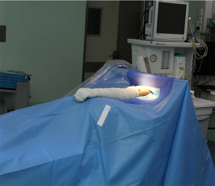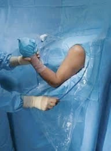Usage: Pull the arm through the fenestration and position the drape up and over the shoulder, unfold the upper drape up and over the patient's head and the lower drape down to the feet; next a fix the adhesive strips to the base of the neck front of the chest and back of the shoulder, adjust the fluid collection pouch to the desired position.